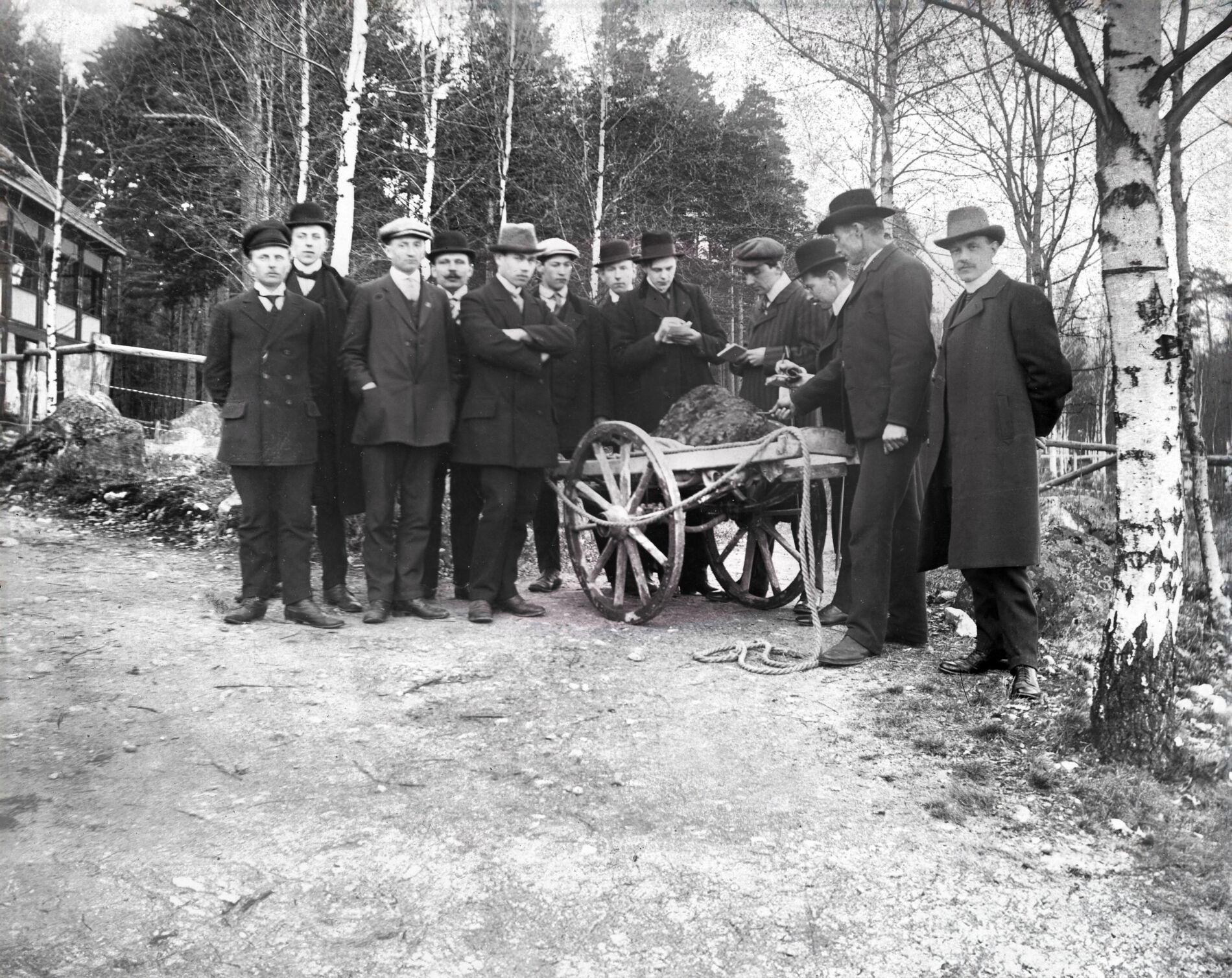 Journalister och goda vänner till Fritiof Dandernell är samlade runt ”Himlakroppen” vid Skyttepaviljongen I Karlbergsskogen. Bild från 1912.