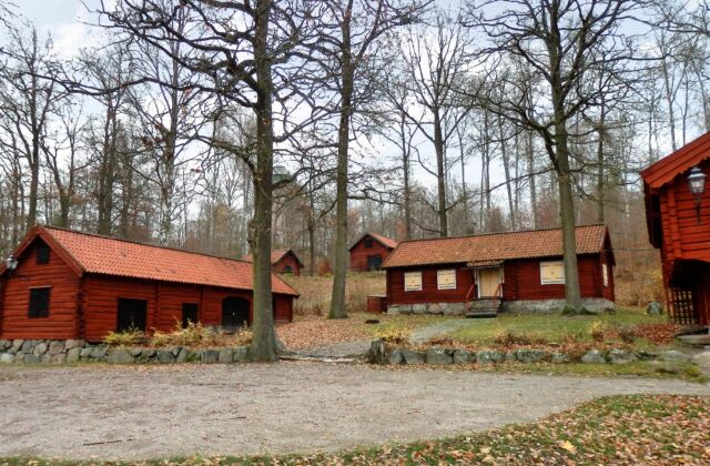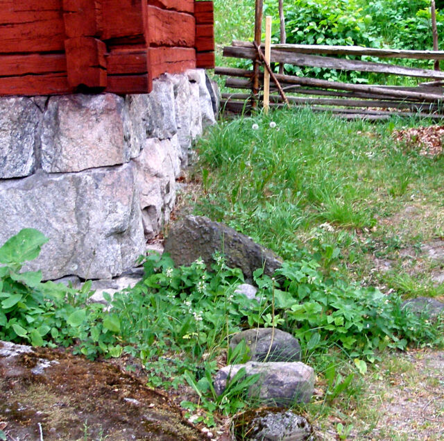 Gammelgården i Karlbergsskogen. Det stora huset rakt fram är parstugan där meteoriten är nedgrävd. Det högra lilla huset längre upp i backen är familjen Dandernells före detta repslageri.