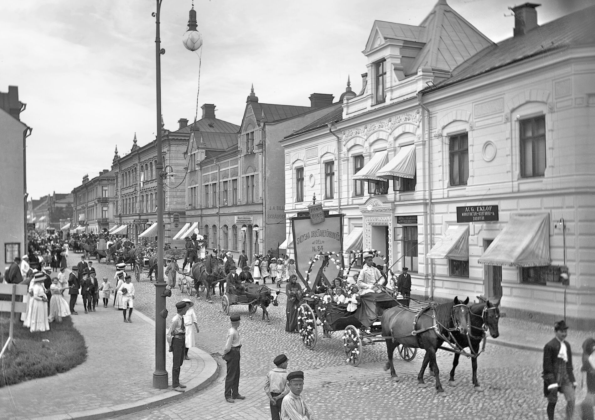 De två hästarna närmast drar en dekorerad vagn med banderollen ”Svenska Arbetareförbundets Afdelning No 84, Köping”. Sen följer en lång rad ekipage bland annat en oxe som drar en kärra. Gatan kantas av finklädda barn och vuxna som förtjusta ser på tåget.
