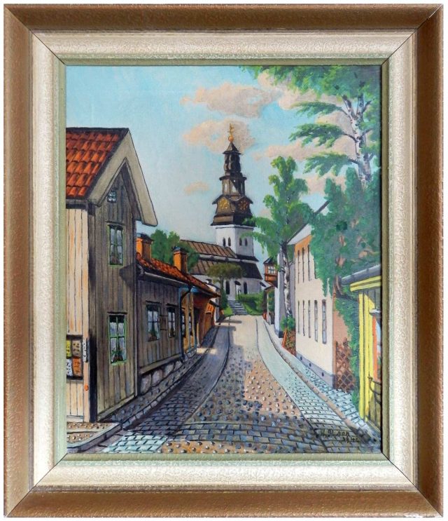 Många Köpingsbor passerade säkert förbi där han satt vid sitt staffli och beundrade tavlan som växte fram. ”Inte dumt alls” tyckte nog många och undrade om inte Arvid kunde tänka sig att måla en likadan till. Och det gjorde han gärna, förstår man, för antalet Kyrkogatsmålningar blev många.