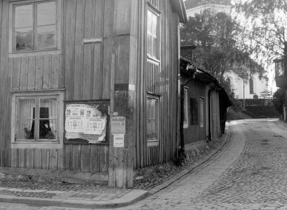 Arvid Pettersson hette en av dem som växte upp längs gatan tillsammans med sin mor Johanna. De bodde i ett gult hus i gården i sydvästra hörnet Kyrkogatan/Scheelegatan.