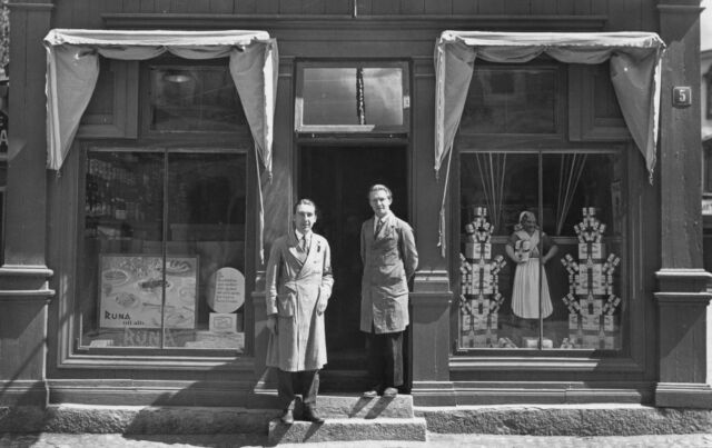 Holger Johnson började sin bana som affärsbiträde och tog på 1930-talet över en speceriaffär som låg i ett av ”Borgmästarns byxben”. Med det menades de två flygelbyggnaderna på borgmästare Schenströms basargård. Husen var byggda 1844, klarade stadsbranden 1889 men föll för grävskoporna när Commersen-huset byggdes 1964-65. Bilden visar Holger till vänster och kompanjonen.