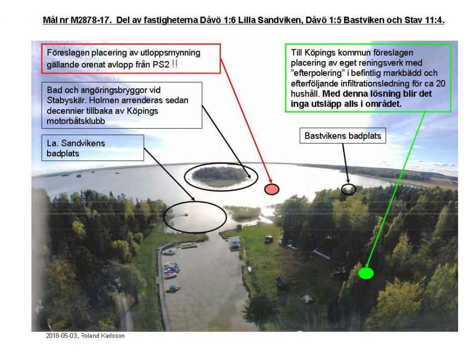 Detta för att undertecknad inte i tid före 10 maj 2018 ska kunna lämna synpunkter på pumpstation PS2 och breddavloppsledning till Nacka tingsrätt. Undertecknad är ägare till jordbruksfastigheten Dåvö 1:6 i Köpings kommun där Köpings kommun avser att ansluta sjö- och bräddavloppsledningar till en pumpstation (nedan kallad Ps 2) som ska placeras på fastigheten Dåvö 1:6.