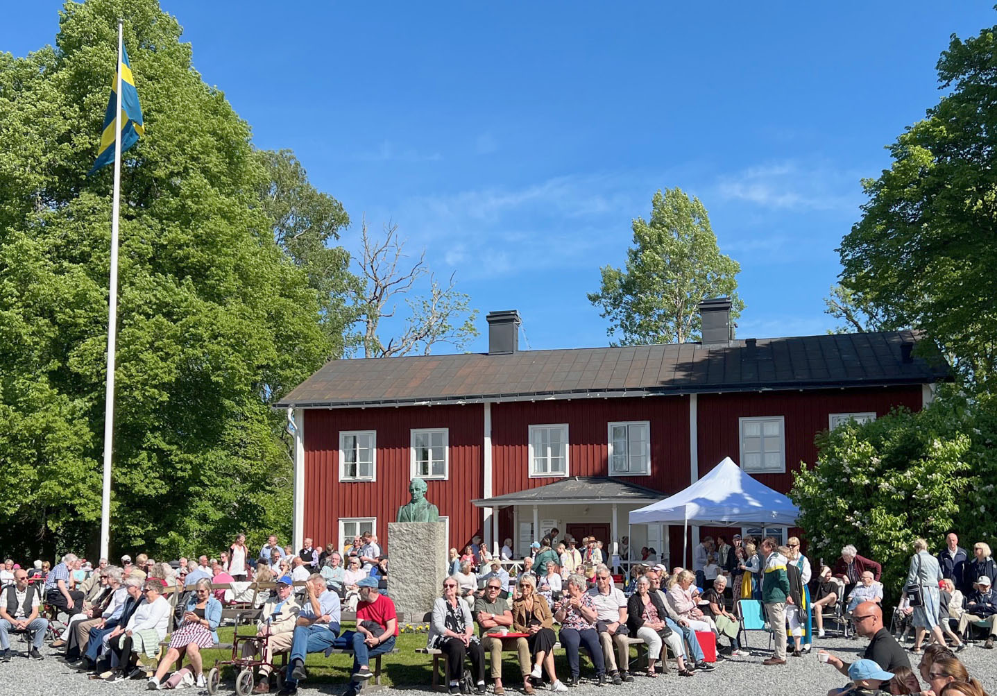 En del sitter på bänkar, en del i gräset, en del har egna stolar med sig. Att fira nationaldagsfrukost på Dybecksgården känns som ”originalet”. Efter två år av uppehåll under pandemin var alla glada att kunna samlas igen, mingla, fika och fira.