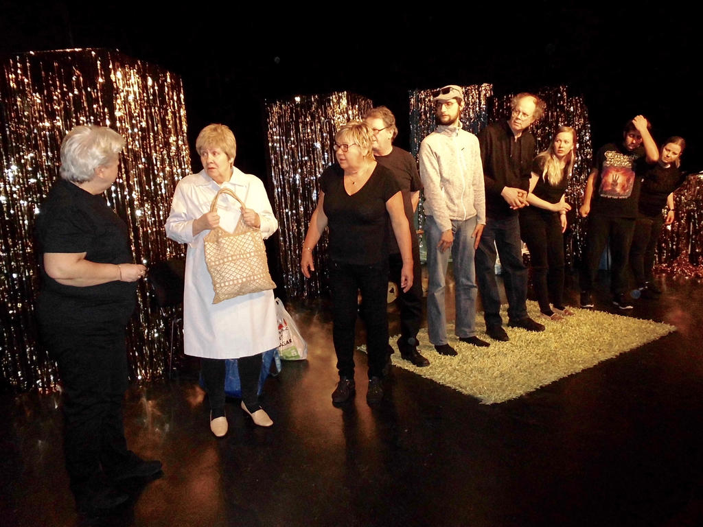 – Gemenskapen, säger ensemblen unisont när de samlats efter söndagens repetition. Och att få byta karaktär mellan sketcherna; i en pjäs är man ju samma karaktär under hela föreställningen. Och så har vi så roligt ihop medan vi repar och kommer på texter.