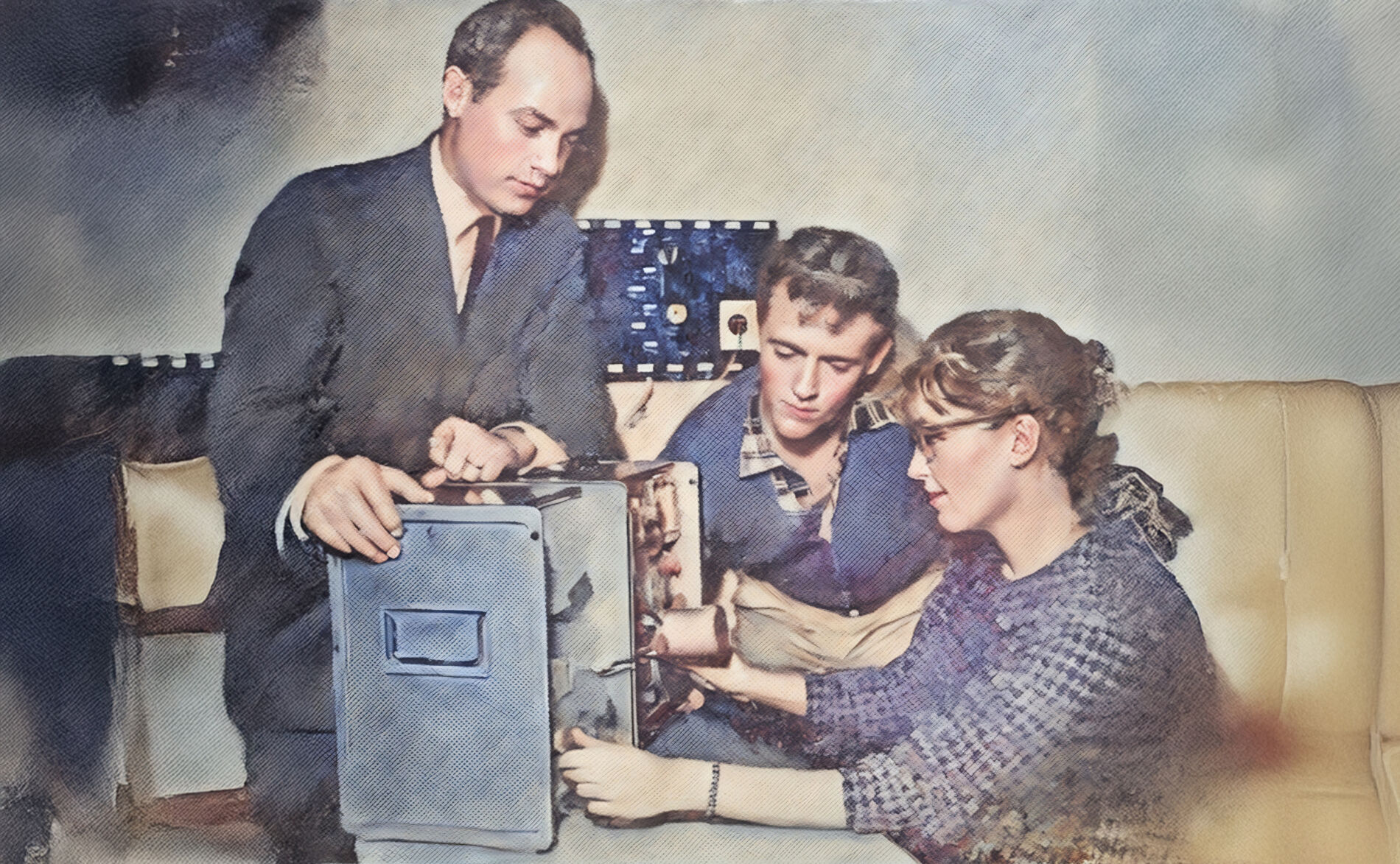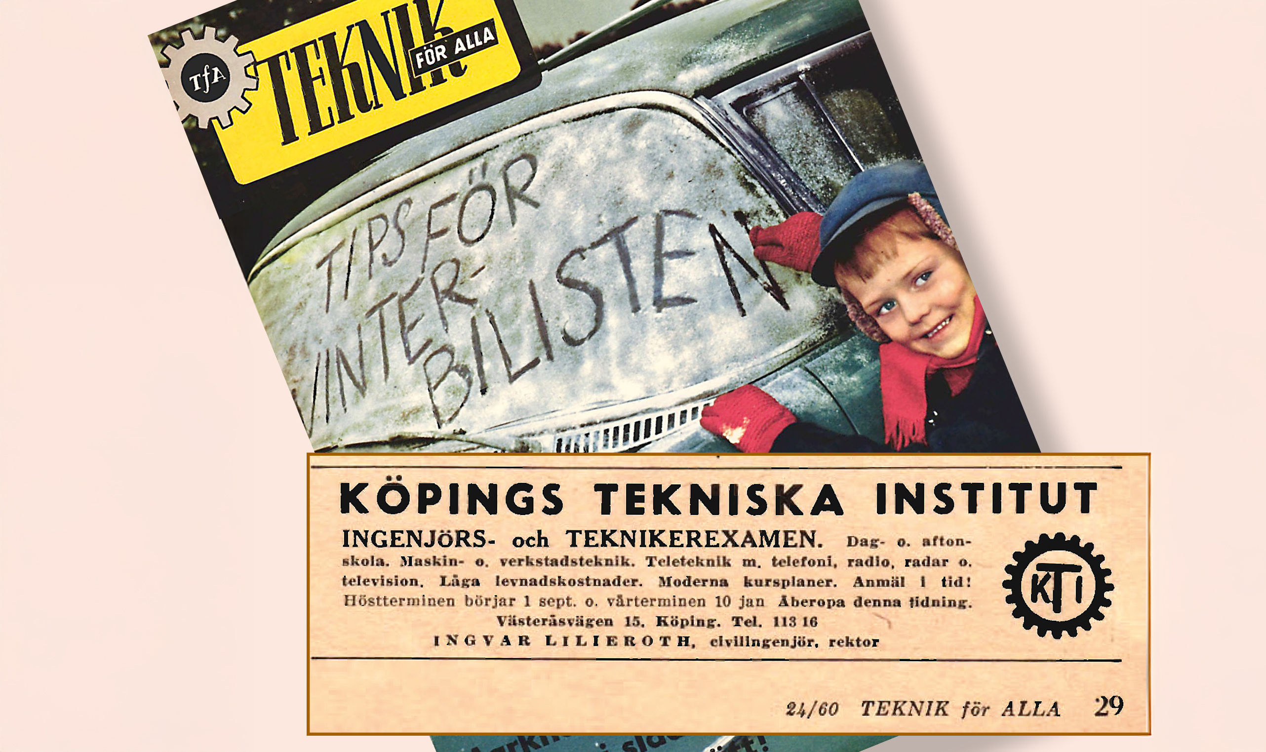 Rubrikbild: — Första dagen var besvärlig men nu tänker jag inte på att jag skiljer mig från mängden, säger Gunnel Hov som inte alls tycker det är konstigt att vara ensam flicka bland 277 manliga elever. Här ser vi Gunnel till höger under en lektion i högfrekvensmätning med Q-meter. Från vänster läraren, förste elektronmästaren Erik Eriksson, vid FTS i Västerås. Mitten: Ivar Hov, från Skoppum, Norge. Han och Gunnel “fann” varandra i klass D3t och blev ett äkta par. Ur Köpingsposten 1960. Källa: Hans Ljungs arkiv.