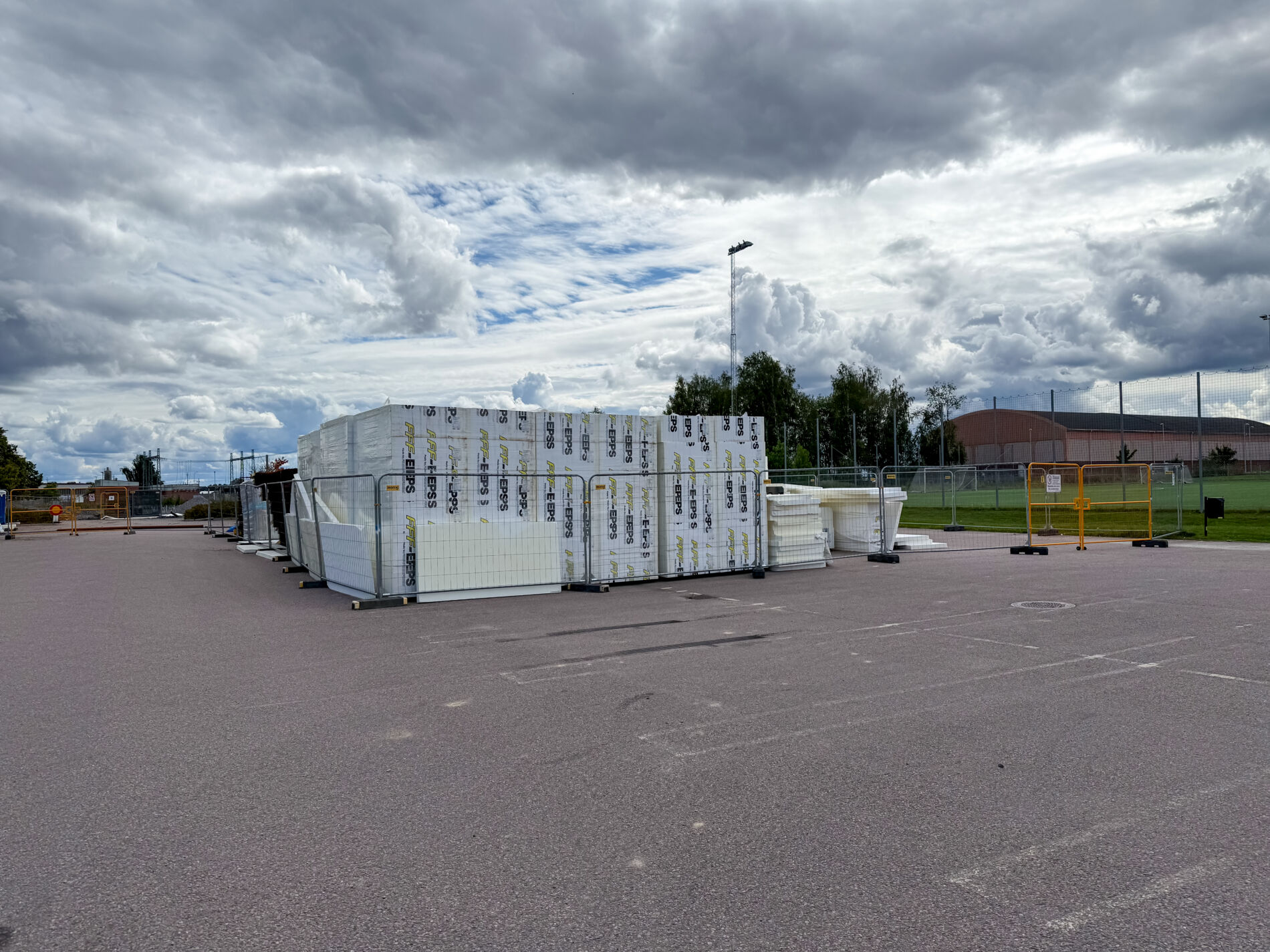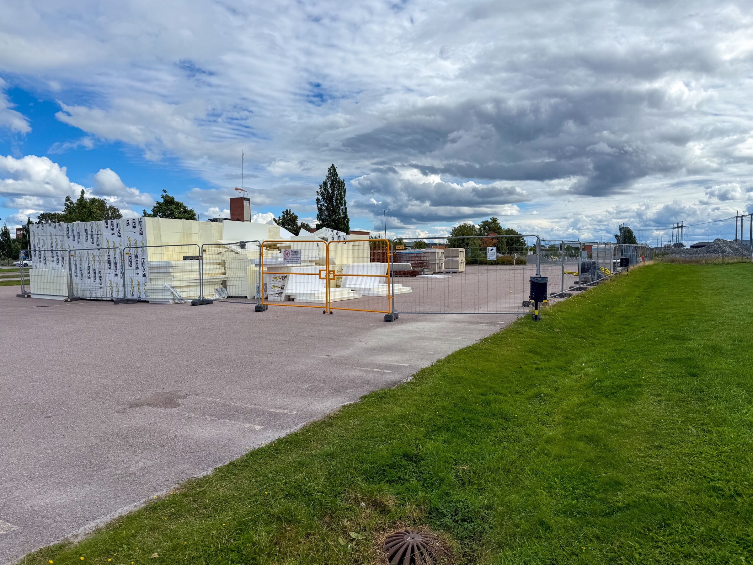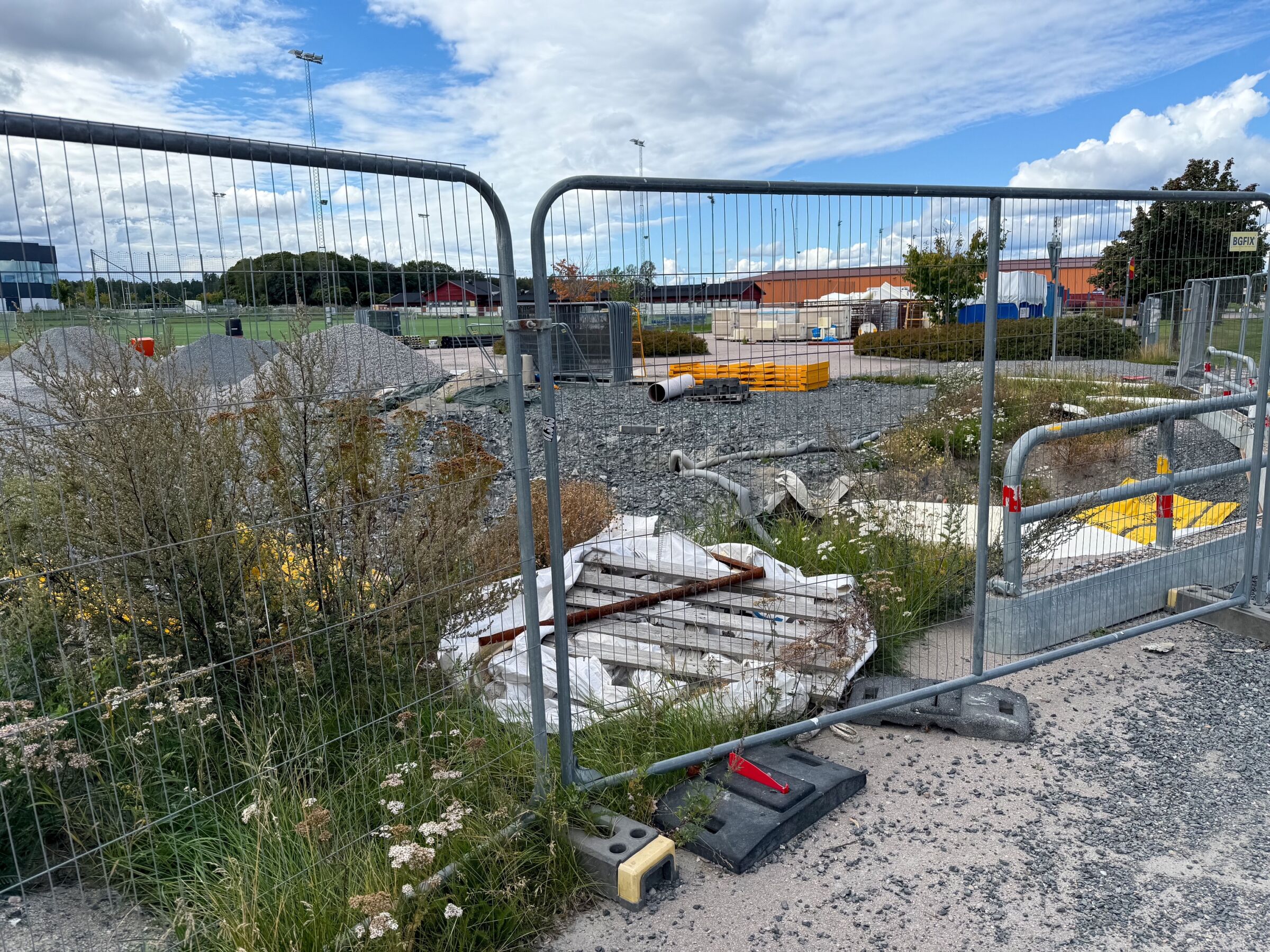 Byggmaterialet är dock fortfarande kvar och en stor del av sportfältets parkering är fortsatt avstängd.