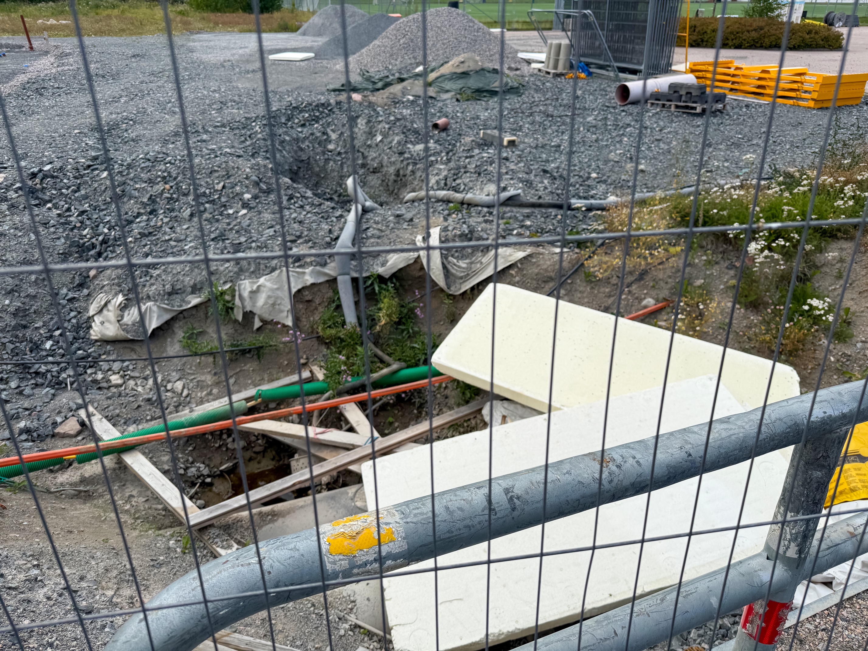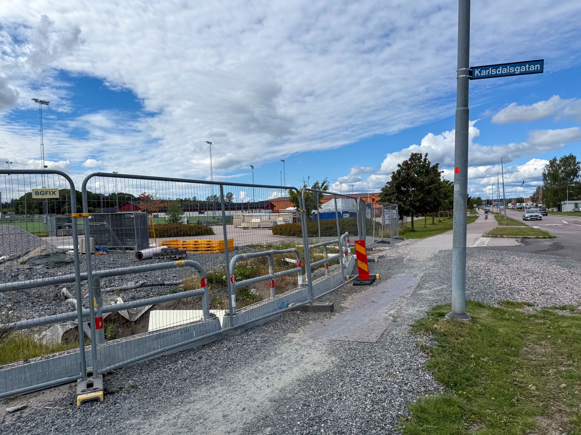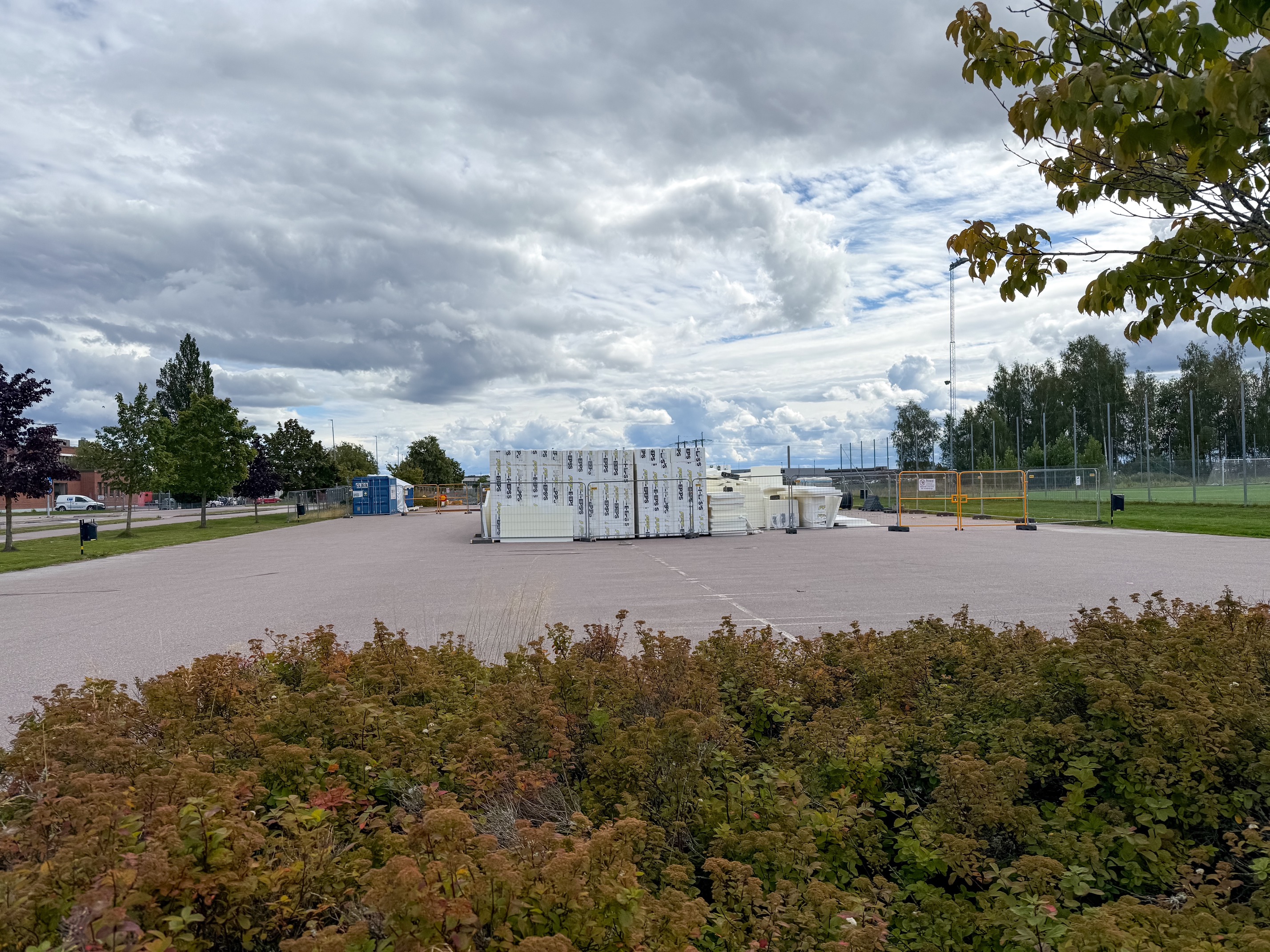 Byggmaterialet är dock fortfarande kvar och en stor del av sportfältets parkering är fortsatt avstängd.