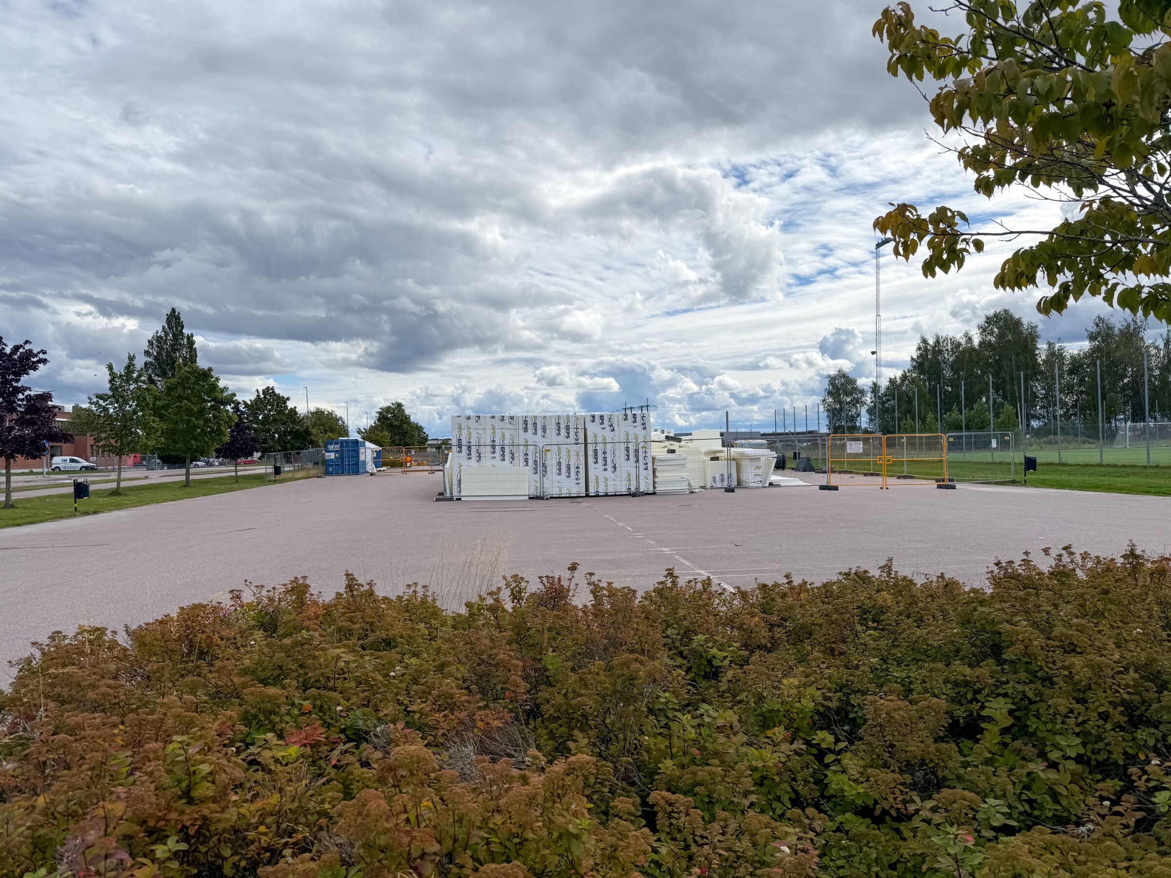 En stor del av parkeringen vid Kristinelunds sportfält förblir oanvändbar medan byggmaterial från den tidigare planerade förskolan fortsatt finns kvar på platsen. Foto: David Eriksson