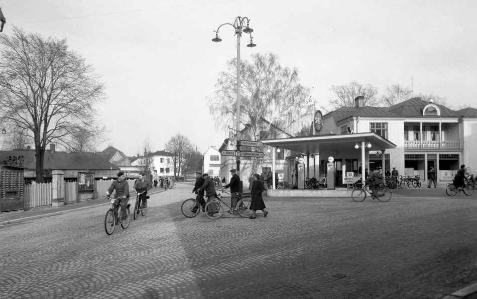 Däremellan syns Shell bensinstation och längre bort skymtar delar av Tubfabriken. På andra sidan gatan syns delar av Nordiska Armaturfabriken – NAF.