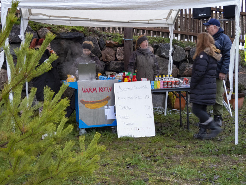 Vid lunchtid var det helt fullt inne i caféet med människor som fikade och handlade. Scouterna sålde varm korv till dem som trotsade regnet och ville äta ute.