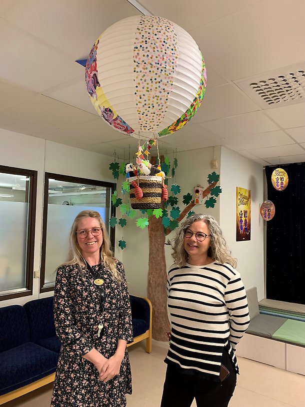 Eva-Karin Granström och Åsa Eriksson med luftballongen som symboliserar läsprojektets resa. Foto: Kungsörs kommun