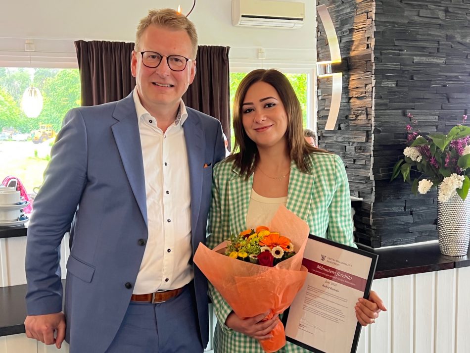 Mikael Bohman har just överlämnat diplom och blommor till Rahaf Ramdo, Månadens Förebild.